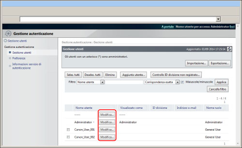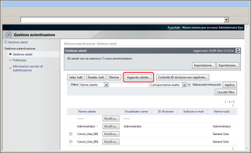 In caso di difficoltà di ricerca dei dati di un utente specifico da un grande numero di utenti registrati, utilizzare la funzione di filtro per limitare la quantità dei dati visualizzati.