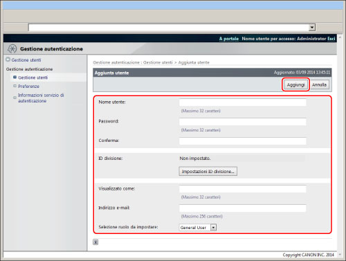 Fare clic su [Impostazioni/Registrazione] → [Gestione utenti] → [Gestione autenticazione].