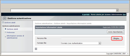 importa le informazioni utente create nel formato di file utilizzabile con Autenticazione utente. L'estensione del file è "csv".