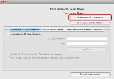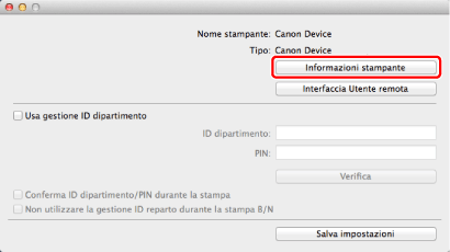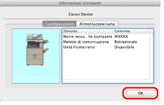 Se il nome del driver della stampante visualizzato nella parte superiore della finestra di dialogo [Informazioni stampante] e il nome della stampante visualizzato come [Nome recuperato dalla stampante] non corrispondono, potrebbe non essere possibile utilizzare correttamente le funzioni della stampante. Se i nomi non corrispondono, eliminare la stampante aggiunta in [Preferenze di Sistema], quindi aggiungerla nuovamente. Per maggiori informazioni vedere la Guida del driver della stampante (vedere " Installazione").