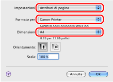 Selezionare [Attributi di pagina] da [Impostazioni] → selezionare la stampante utilizzata da [Formato per] → selezionare un formato carta per la stampa da [Dimensioni].