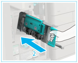 Dopo aver eliminato l'inceppamento punti, riposizionare manualmente i punti nell'unità di pinzatura a sella. (Vedere "Riposizionamento punti pinzatura a sella".)
