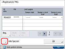 (Azzera). Il limite al numero di pagine che possono essere generate può essere impostato tra 0 e 999.999 pagine. Una volta raggiunto il limite delle pagine, non è possibile continuare con la copiatura, la scansione o la stampa.