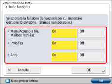 Se [Gestione ID divisione] è impostato su [On], le funzioni diverse da quelle descritte sopra e le applicazioni MEAP funzionano come indicato sotto indipendentemente dalle impostazioni di limitazione delle funzioni.