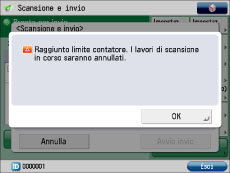 La macchina interrompe la scansione se viene raggiunto il valore impostato in Limite scansioni durante l'acquisizione degli originali posizionati nell'alimentatore. (Gli originali già acquisiti prima del raggiungimento del limite non vengono sommati al conteggio delle scansioni.)