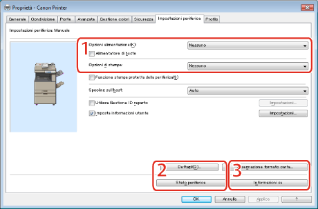 È possibile richiamare le informazioni sulla periferica e aggiornare le impostazioni visualizzate nella scheda (vedere "Impostazione delle opzioni della stampante").