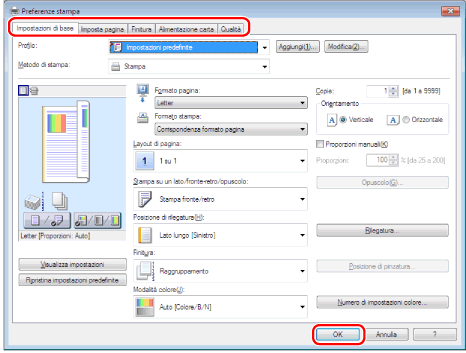 La scheda [Impostazioni di base] comprende alcune impostazioni di base del driver. Le impostazioni configurabili nella scheda [Impostazioni di base] possono essere configurate anche in altre schede.