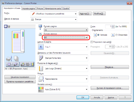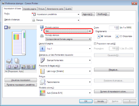 Selezionare il formato pagina del documento creato nell'applicazione da [Formato pagina].