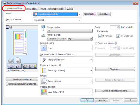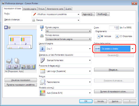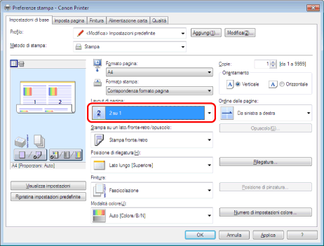 Se non è possibile selezionare le opzioni per [Layout di pagina], visualizzare la scheda [Impostazioni periferica], quindi selezionare [Auto] o [Abilitato] da [Spooling sull'host]. Per istruzioni su come visualizzare la scheda [Impostazioni periferica], vedere "Impostazione delle opzioni della stampante".