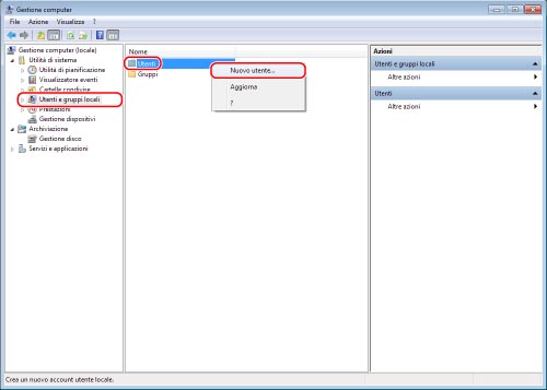 (Start) → fare clic con il pulsante destro del mouse su [Computer] → fare clic su [Gestisci] → [Gestione computer (locale)] → [Utilità di sistema] → [Utenti e gruppi locali] → fare clic con il pulsante destro del mouse su [Utente] → selezionare [Nuovo utente].