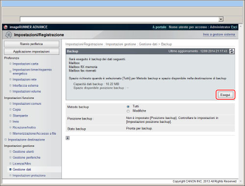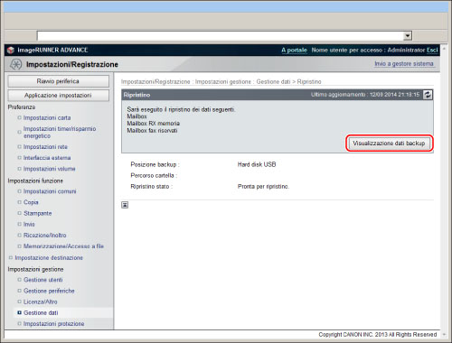 Per visualizzare il registro di backup/ripristino, fare clic su [Impostazioni/Registrazione] → [Gestione dati] → [Registro backup/ripristino].