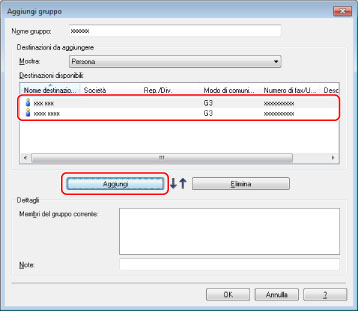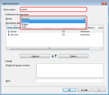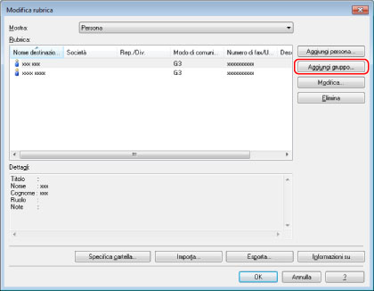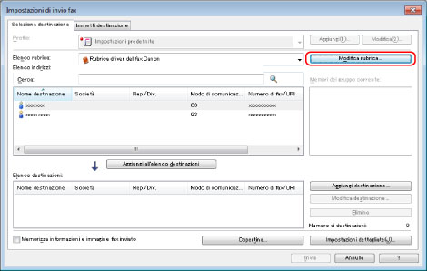 È inoltre possibile modificare le informazioni di gruppi di destinatari precedentemente registrati. Per ulteriori informazioni, fare clic su [?] nell'angolo inferiore destro della finestra del driver del fax per visualizzare la Guida.