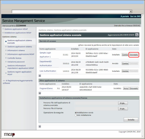 Non è possibile disinstallare Autenticazione utente e Autenticazione ID divisione (Gestione ID divisione). Inoltre, non è possibile disinstallare il servizio di accesso attualmente in uso (servizio di accesso per il quale è visualizzato lo stato <Arresto dopo il riavvio>) e il servizio di accesso che si userà al prossimo avvio della macchina (servizio di accesso per il quale è visualizzato lo stato <Avvio dopo il riavvio>).