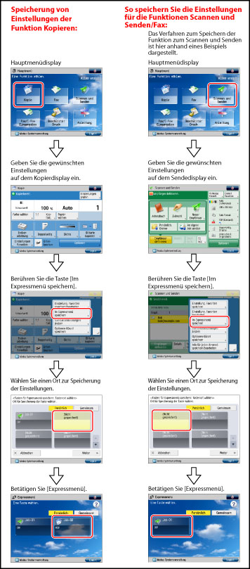 Eine Anleitung zum Speichern einer persönlichen/gemeinsamen Taste finden Sie am Beispiel der Funktion Scannen und Senden im Abschnitt "Speichern von persönlichen/gemeinsamen Tasten".