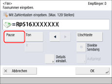 Berühren Sie die Taste [Pause] nach der Eingabe der Nummer der Amtsleitung ('R' im Beispiel oben) und vor der Eingabe der Faxnummer.