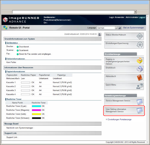 Anzeigen der Seite Verwaltungsservice für Anwenderinformationen