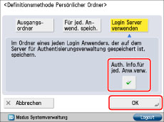 Sie können persönliche Ordner verwenden, ohne Authentisierungsinformationen für jeden Anwender festzulegen, wenn das System und der Dateiserver mit denselben Authentisierungsinformationen betrieben wird. Heben Sie in diesem Fall die Auswahl von [Auth. Info.für jed. Anw.verw.] auf.