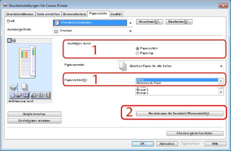 Wenn Sie auf einem bestimmten Papiertyp drucken möchten, geben Sie entweder die Papierzufuhr mit diesem Papier oder den Papiertyp an.