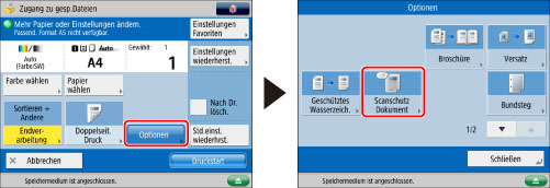Berühren Sie [Optionen] → [Scanschutz Dokument].