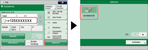 Wenn [Sendebericht] in [Einstellungen Funktion] (Einstellungen/Speicherung) aktiviert ist (wie unten dargestellt), kann [Sendebericht] in [Optionen] nicht festgelegt werden.