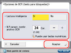 Pulse [Sí] para <Lectura inteligente> → pulse [-] o [+] para <N.º caract. nombr. archivo OCR> para establecer el número de caracteres del nombre de archivo → pulse [Aceptar].
