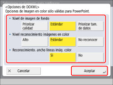 El nivel de reconocimiento y el tamaño de datos están entre los de [Alto] y [No reconocer].