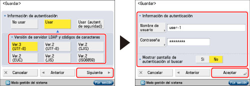 Seleccione un elemento para <Versión de servidor LDAP y códigos de caracteres> para cada elemento → pulse [Siguiente].