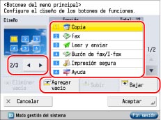 Si el número de botones de función supera el número de botones de la disposición especificada en <Botones del menú principal>, los botones sobrantes aparecen después de la página 2 de la pantalla Menú principal. En la pantalla Menú principal puede aparecer un máximo de nueve botones.