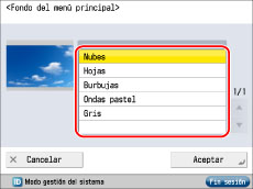 Las opciones de la pantalla Menú principal sólo puede especificarlas un usuario con los privilegios requeridos. Para obtener más información, consulte "Establecer administradores".