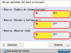 en la parte superior derecha de la pantalla, se muestra la siguiente pantalla. Seleccione las opciones en la pantalla mostrada y establezca la visualización de la pantalla Menú principal.