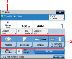 Puede guardar el botón de acceso directo [Opciones] que se muestra en cada pantalla de función. Sólo en la pantalla Copia, puede guardar los botones de acceso directo [Opciones] y [Opciones favoritas]. Los botones de acceso directo guardados aparecen en cada pantalla de función.