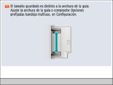 ![]() Si aparece una pantalla en la que se le pide que ajuste las guías deslizantes o compruebe [Opciones prefijadas de bandeja multiuso] en Configuración, ajuste la anchura de las guías deslizantes para que coincida con el tamaño de papel guardado en Opciones prefijadas de bandeja multiuso, o en [Preferencias] (Configuración), pulse [Opciones prefijadas de bandeja multiuso] → [Especificar siempre] → seleccione [Estándar]. (Consulte "Establecer el método para seleccionar el papel de la bandeja multiuso".)