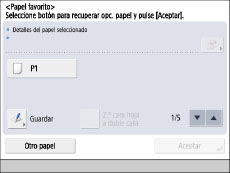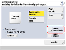 ![]() Si aparece una pantalla pidiéndole que seleccione el papel utilizado con frecuencia, pulse [Guardar] y guarde un tamaño de papel, o seleccione [Opciones prefijadas de bandeja multiuso] en [Preferencias] (Configuración) → [Especificar siempre] → [Estándar]. (Consulte "Establecer el método para seleccionar el papel de la bandeja multiuso".)