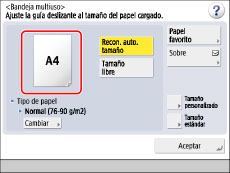 Si el tamaño de papel que va a cargar en la bandeja multiuso es distinto al tamaño de papel guardado en [Opciones prefijadas de bandeja multiuso] en [Preferencias] (Configuración), seleccione [Estándar] para [Especificar siempre]. (Consulte "Establecer el método para seleccionar el papel de la bandeja multiuso".)