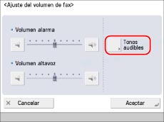 (Ajuste del volumen) en el panel de control, puede ajustar el volumen de alarma y el volumen de transmisión de envío y recepción de fax. También puede establecer diversos tonos para que suenen según las operaciones realizadas o el estado del dispositivo.