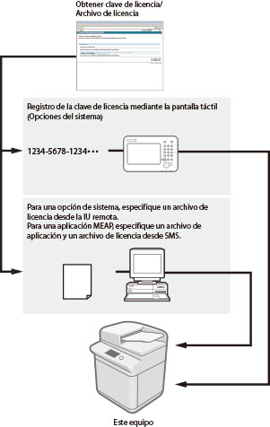http://canon.com/fau/downloads Cuando descargue los manuales y el software asociado de las opciones de sistema/aplicaciones MEAP, prepare el certificado del número de acceso de la licencia que forma parte del paquete.