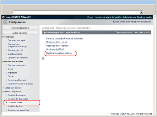 Según la opción de sistema/aplicación MEAP instalada, puede descargar el manual o el software relacionado para la opción de sistema/aplicación MEAP en la URL que aparece en la pantalla después de la instalación.