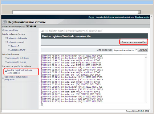 Desde la página del portal de IU remota, haga clic en [Configuración] → [Licencias/Otros] → [Registrar/Actualizar software].