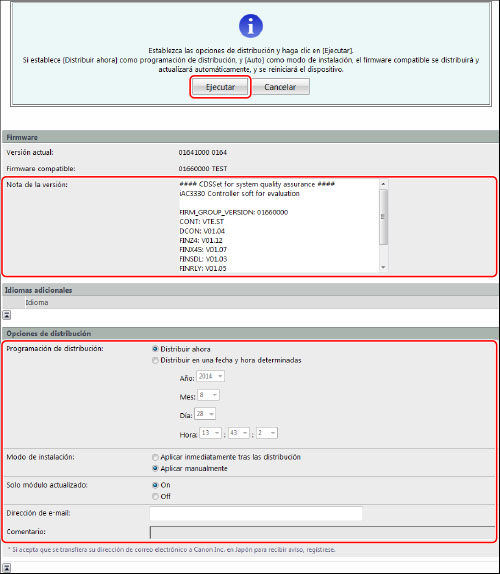 [Distribuir ahora]: Descarga el firmware tras especificar la opción de distribución.