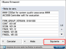 Nota de la versión: Si el nuevo firmware tiene notas de la versión, se muestra esa información.