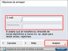 Introduzca el comentario que se añadirá automáticamente al mensaje de correo electrónico. Si introduce el nombre del modelo, puede identificar a qué dispositivo corresponde el estado recibido por correo electrónico.