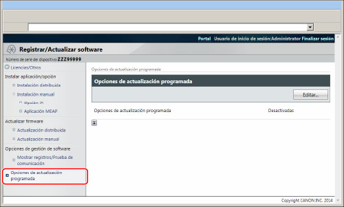 Pulse [Opciones de gestión] → [Licencias/Otros] → [Registrar/Actualizar software].