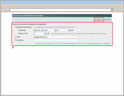 Seleccione [Activar opciones de actualización programada] → especifique cada opción → haga clic en [Establecer].