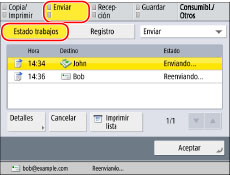 Se imprime una lista de transmisiones de fax, correo electrónico, I-fax y servidor de archivos en la lista de trabajos de envío.