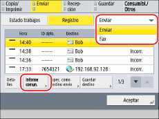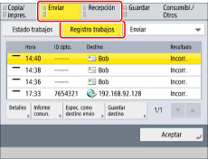 Si [Mostrar registro de trabajos] en [Opciones de gestión] (Configuración)está desactivado, no se muestran los siguientes elementos.