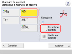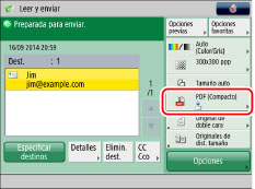 El modo PDF con búsqueda permite realizar OCR (reconocimiento óptico de caracteres) para extraer datos de la imagen leída que se pueden reconocer como texto y agregarlos en forma de capa transparente de texto con el fin de crear un archivo PDF en el que se pueda buscar. Este modo permite buscar rápidamente la información necesaria en archivos PDF. Si utiliza imageRUNNER ADVANCE C3320, se necesita el Kit de Envío Universal Color.