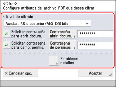 Puede cifrar archivos PDF estableciendo una contraseña. Solamente los usuarios que introduzcan la contraseña correcta podrán abrir, imprimir o cambiar el archivo PDF. Para utilizar esta función se requiere el Set de Seguridad.