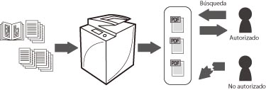 Utilizando el modo PDF reconocible, podrá convertir documentos de papel en PDF que es texto reconocible. Por ejemplo, podrá ahorrar espacio digitalizando documentos de papel como, por ejemplo, un curriculum vitae. El cifrado de archivos PDF le permitirá restringir a usuarios no autorizados la apertura de archivos y la búsqueda de información. Si establece una contraseña cuando envía documentos leídos, podrá evitar que ocurra la divulgación de información si los documentos se envían a un destino equivocado.