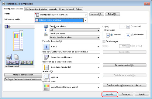 Especifique las opciones de impresión en cada ficha de la pantalla del controlador de impresora → haga clic en [Aceptar].