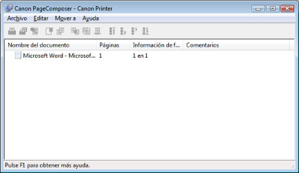 Aparece el cuadro de diálogo [Canon PageComposer]. En la lista de documentos aparecen los documentos combinados.